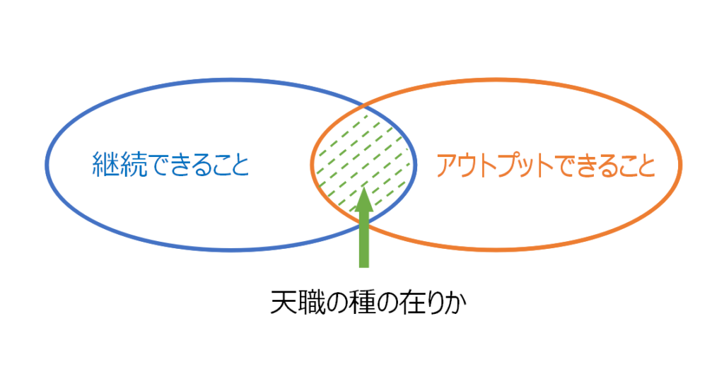 上記2点から、僕は人それぞれの 【継続できること】 の集合 と 【アウトプットできること】 の集合 が重なる部分が個人にとっての【天職の種】 であると考えています。